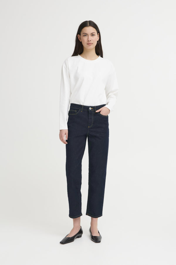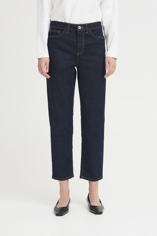 Dark washed denim jeans with 5 pockets and a button and zip fastening.